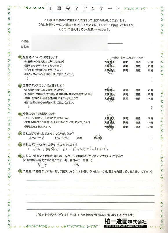 <担当者から一言>御主人様とは仕事でよく御一緒させて頂いております。プランも気に入って頂けて嬉しいです。奥様、アプローチ廻りの植栽よろしくお願い致します。